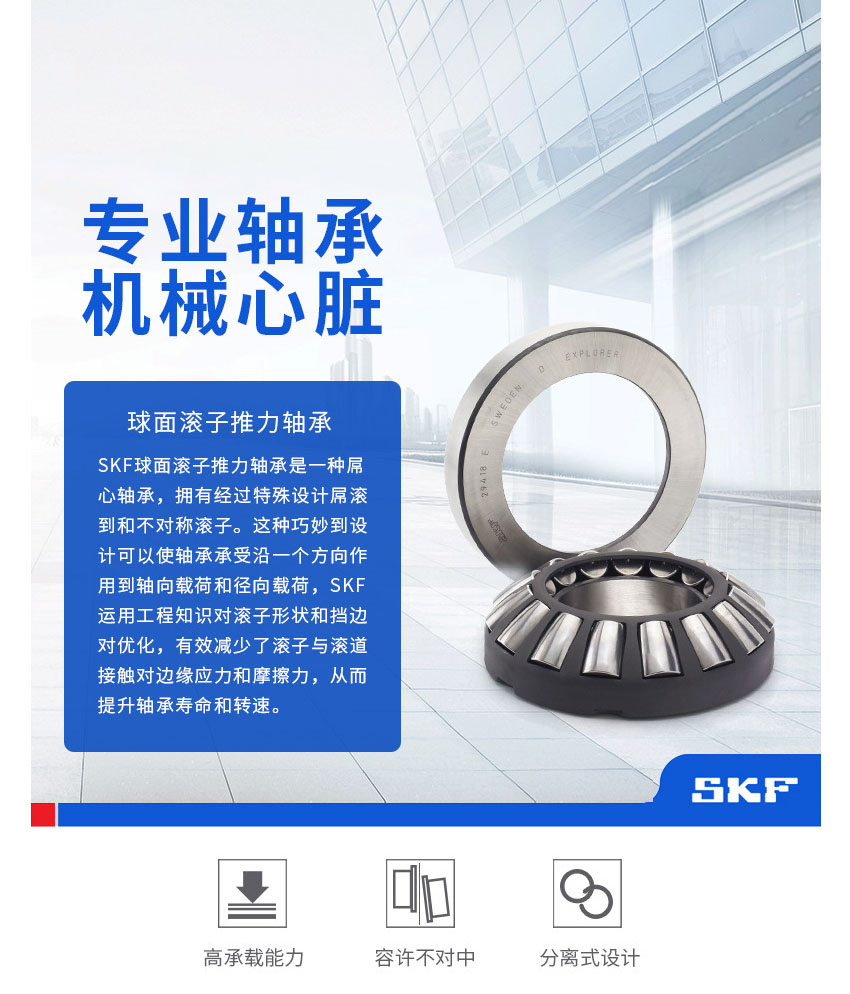 推力滾子軸承是用于承受軸向載荷為主的軸、徑向聯(lián)合載荷,但徑向載荷不得超過軸向載荷的 55% 。與其他推力滾子軸承相比,此種軸承摩擦因數(shù)較低,轉速較高,并具有調(diào)心性能。